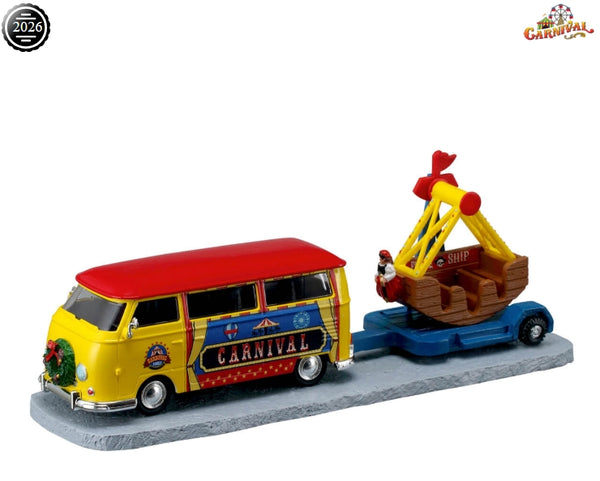 Description: Towing Van With Carnival Ride captures the excitement of Carnival Village as the fun rolls into town. Brightly colored and full of detail, this cheerful van pulls a classic carnival ride behind it, ready to be set up for another night of lights, laughter, and thrills. The playful graphics and compact scale give the scene a sense of motion, making it feel like the carnival is always on the move. Designed as a tabletop accent, this piece adds energy, story, and behind the scenes charm to any carnival display, perfectly setting the stage for the fun to begin.